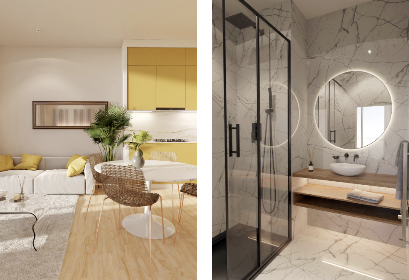 Parquet en chêne massif, marbre de Carrare, robinetterie Grôhe, meuble salle de bain Porcher.... Que des matériaux de qualités pour l'ensemble de la construction et des appartements