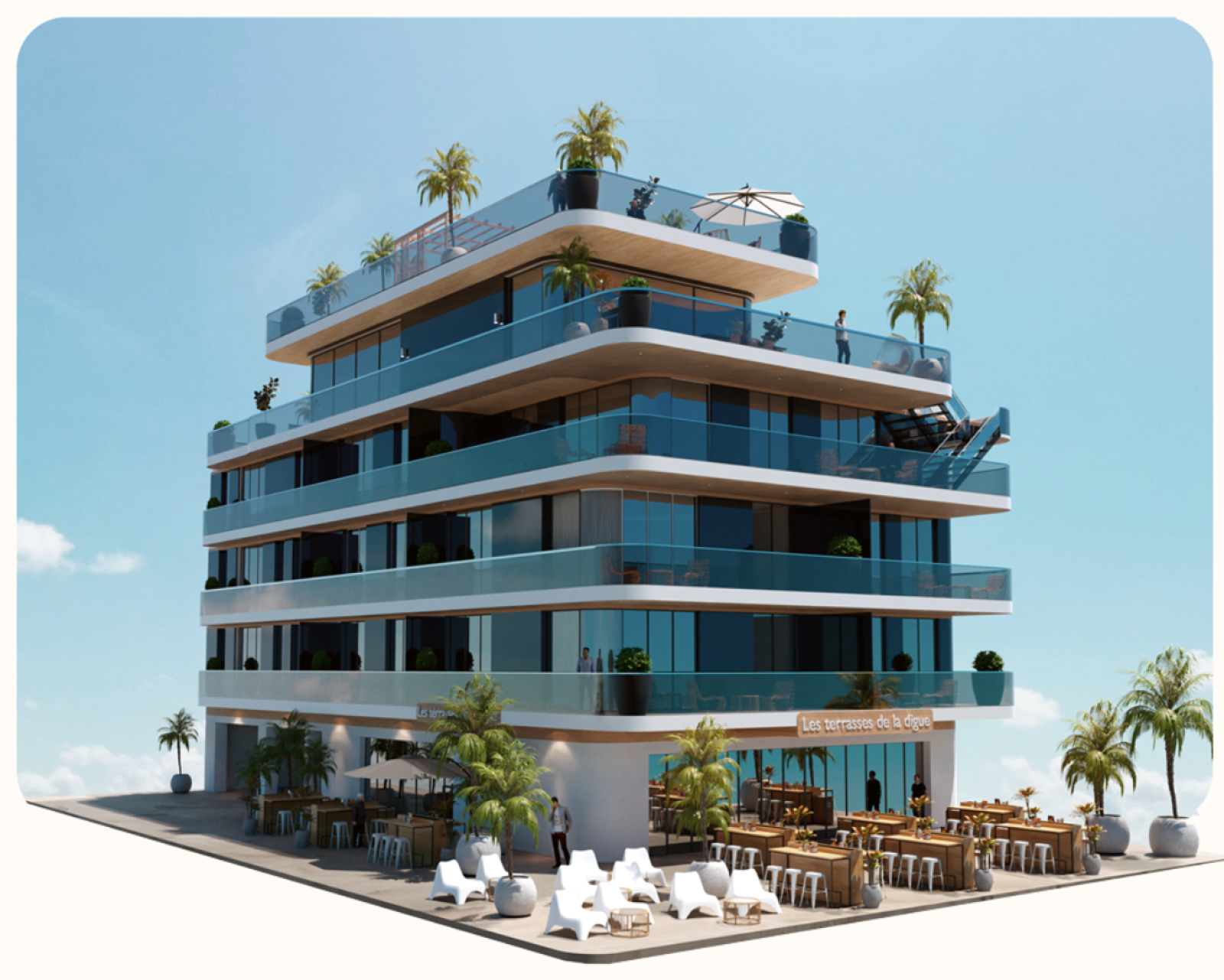 Création d’un restaurant « Les Terrasses de la Digue » avec terrasse en rez-de-chaussée avec vue sur mer.