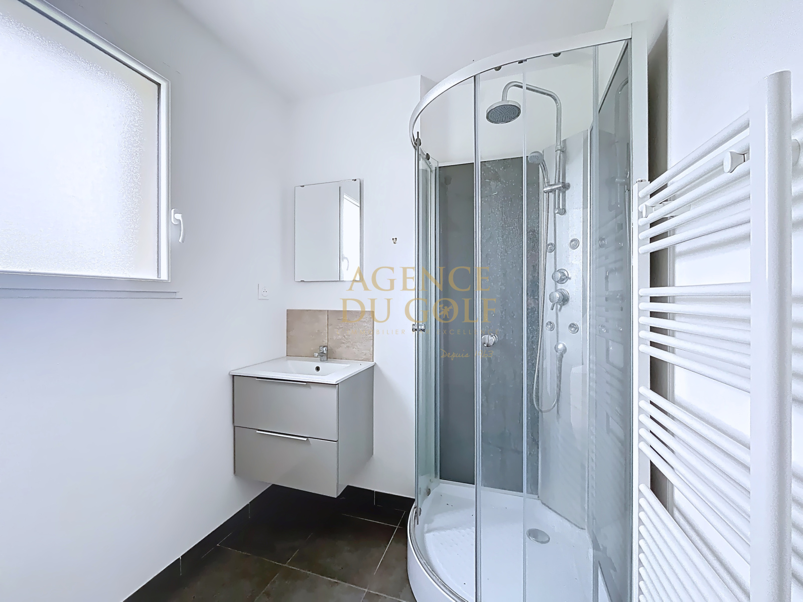 Une grande salle d’eau avec douche, branchements pour machine à laver et sèche-linge, WC,