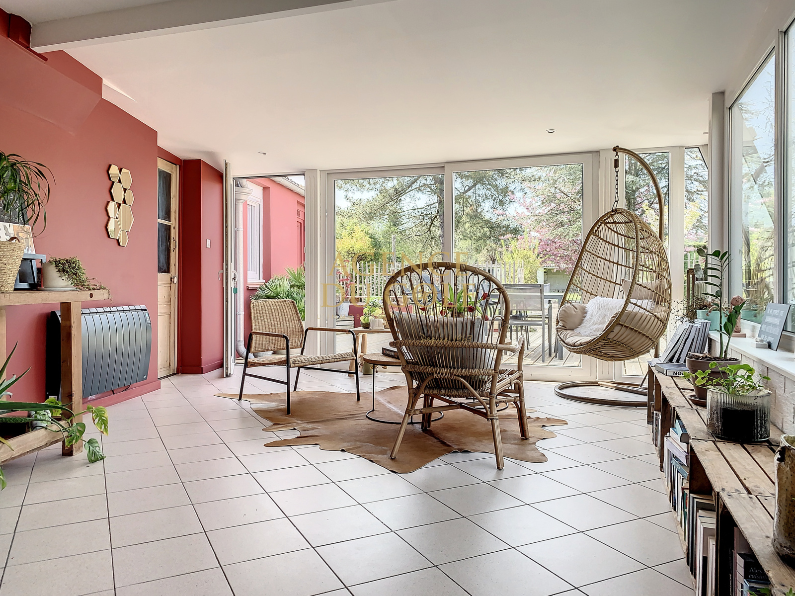 Une grande véranda isolée et chauffée donnant sur un beau jardin avec terrasse en bois.