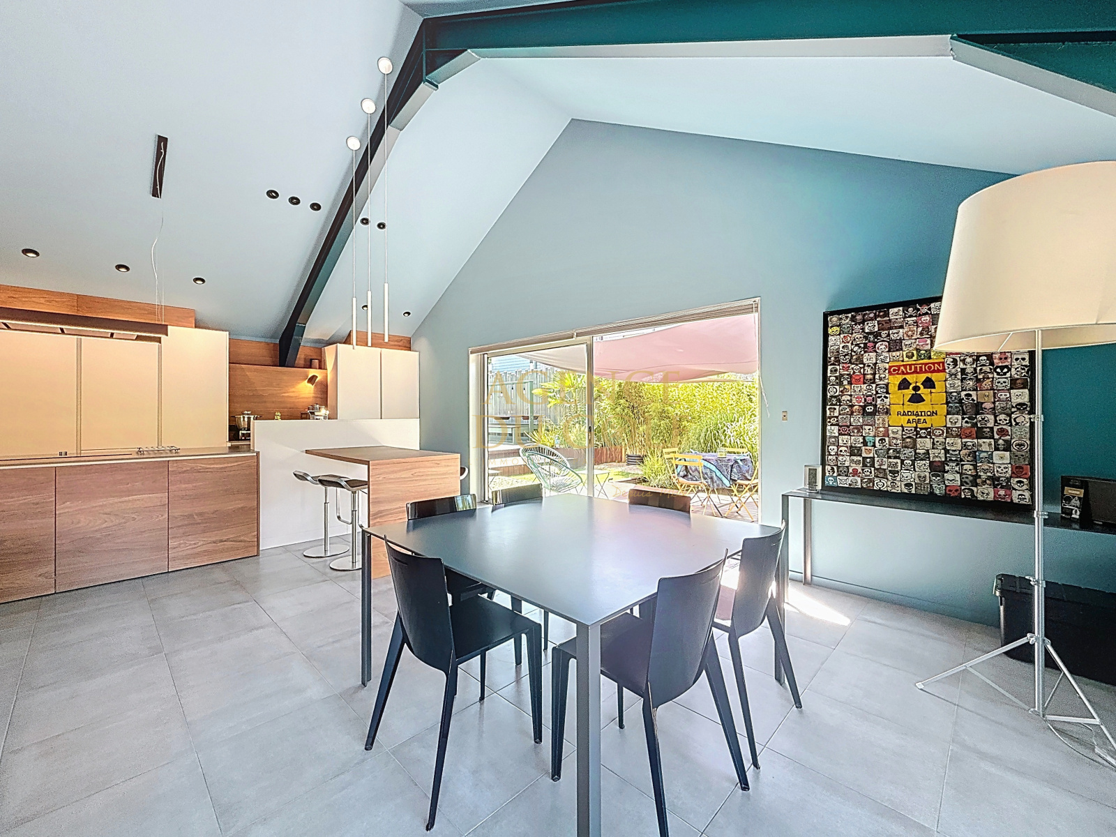 Un art de vivre contemporain, Dès l’entrée, la magie opère : une grande pièce de vie baignée de lumière grâce à une triple exposition nord-sud-ouest et à une hauteur cathédrale spectaculaire, donnant une impression d’espace et de légèreté. Le séjour s’ouvre sur un jardin arboré et paysager, offrant à chaque orientation une perspective différente. La cuisine ouverte en noyer américain, réalisée sur mesure, est un chef-d’œuvre de design et de fonctionnalité : électroménager haut de gamme Miele, rangements dissimulés, intégration parfaite — un espace aussi beau que performant.