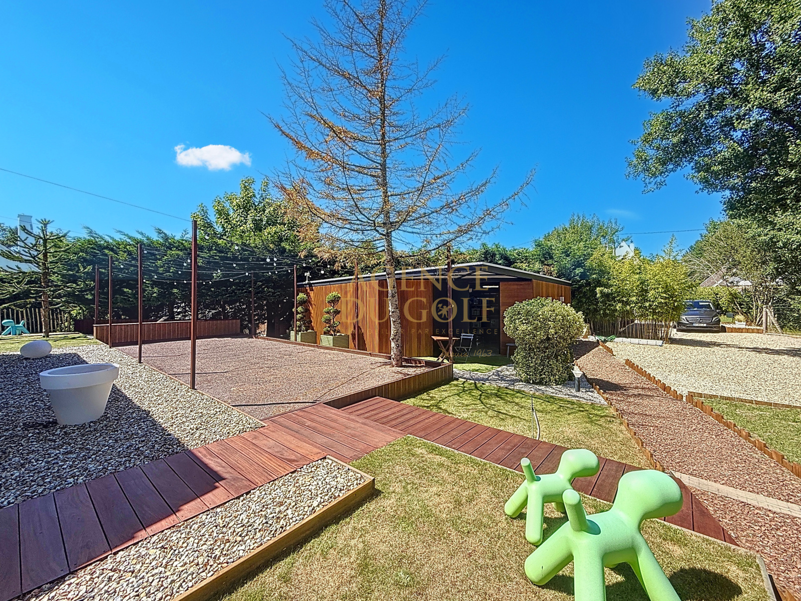 Terrasse en bois Cumaru, bassin à poissons, terrain de pétanque réglementaire, espace brasero creusé