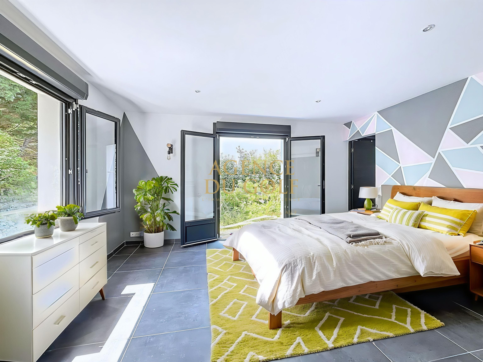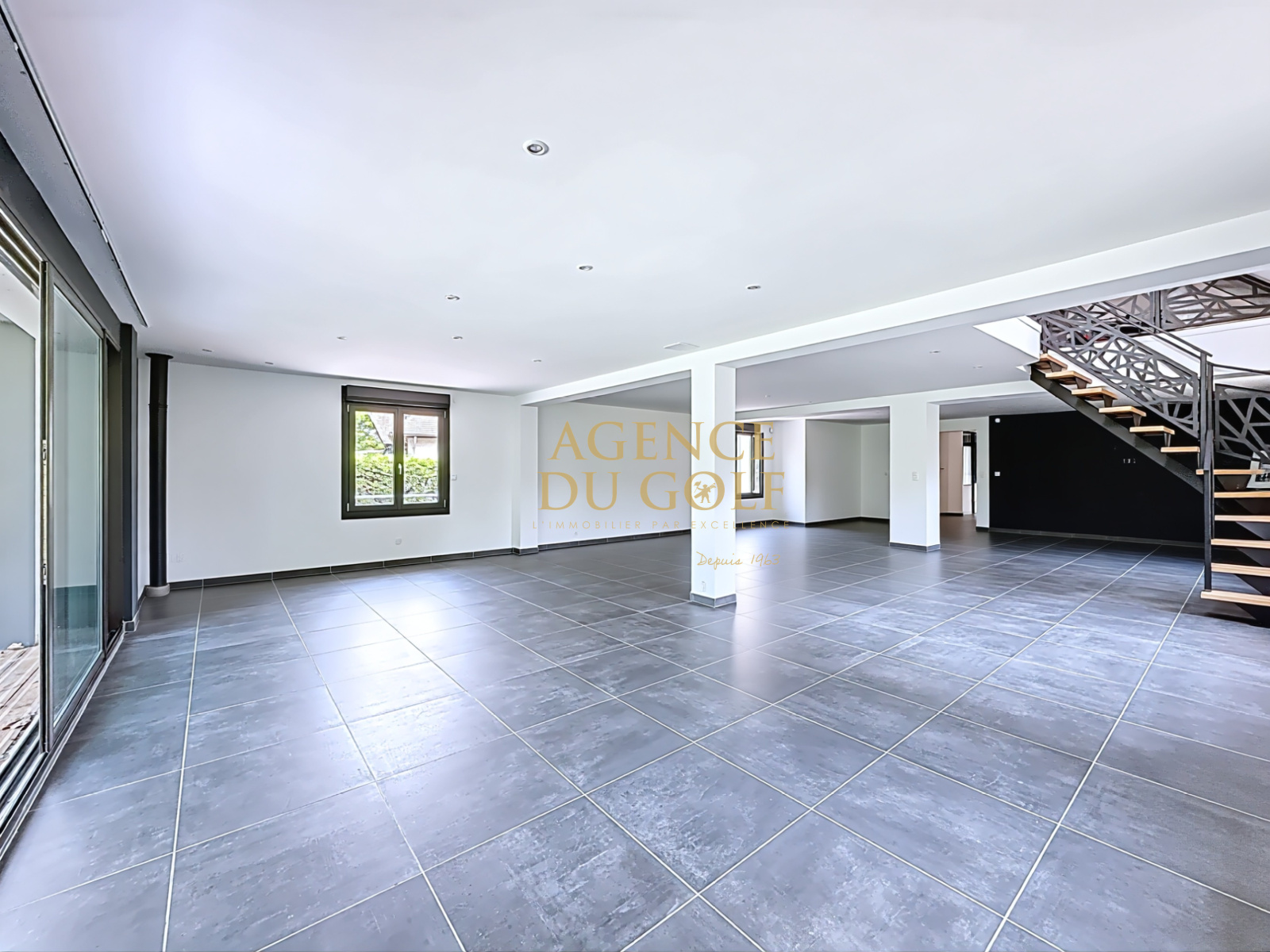 Au niveau inférieur : une cinquième chambre, une salle de bain, une grande laverie, un espace bien-être avec jacuzzi et sauna, plusieurs espaces de rangement, et un grand double garage accessible depuis l’intérieur.