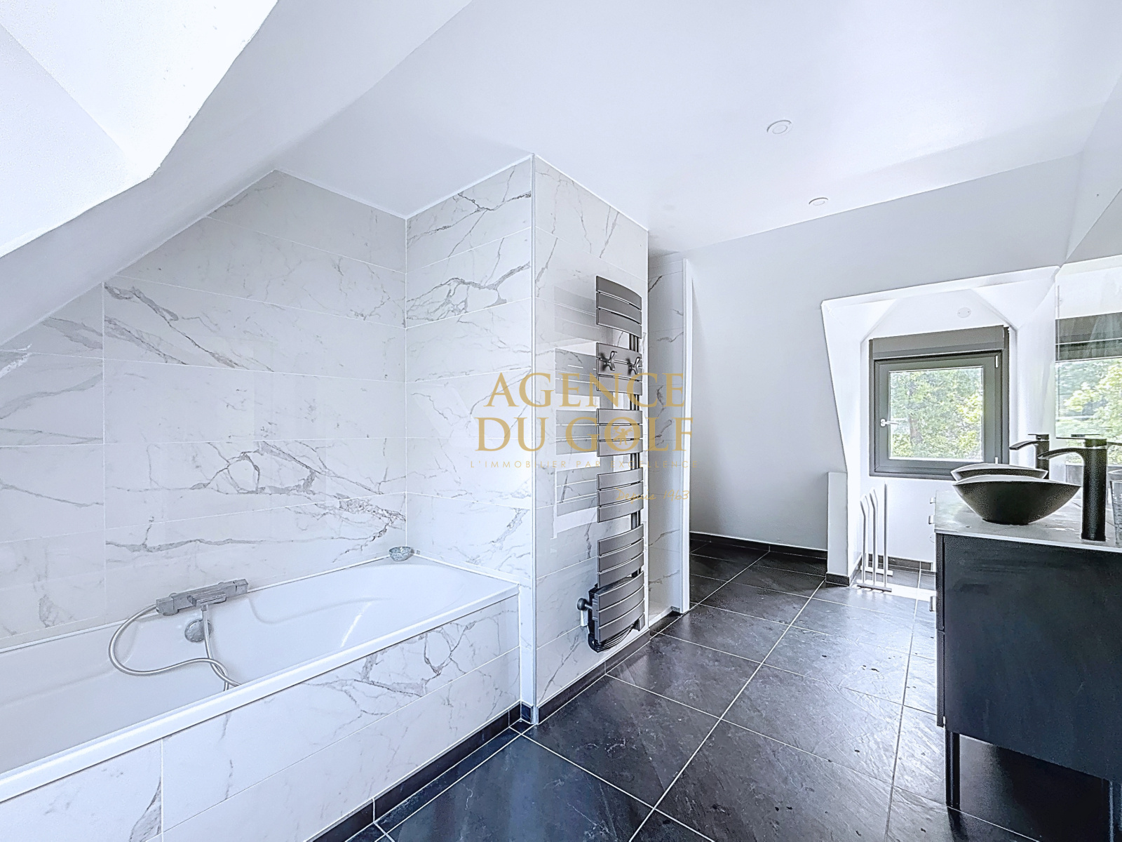 À l’étage : un espace bureau avec balcon, quatre chambres, chacune avec salle d’eau privative, dont une master suite avec baignoire, douche et WC. Trois WC au total sur ce niveau.